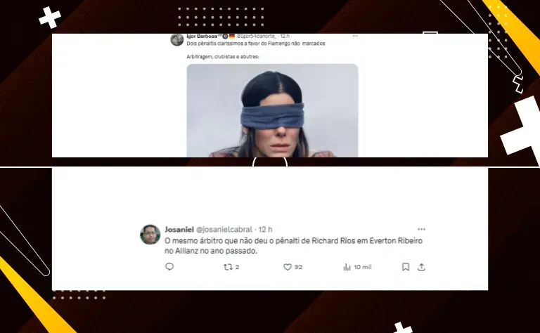 “Lance no Erick. O Rodrigo Alonso, do VAR, que dá o pênalti que o Allan toca na bola e não dá o pênalti no que o cara toda direto no pé do Pulgar. Eu não consigo entender. Qual é o critério? Por que um sim e o outro não? Por favor, só usem o mesmo critério”, comentou Tite.