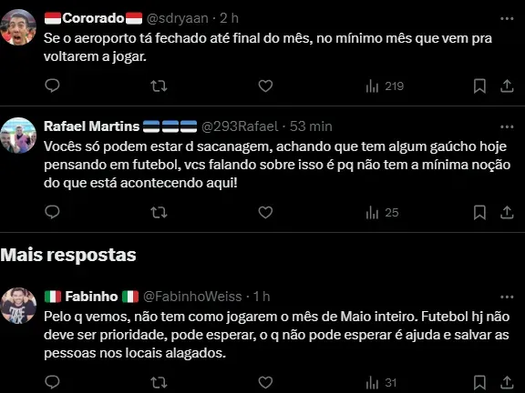 Vale lembrar que, com o aero fechado por quase 1 mês, a locomoção fica restrita aos meios terrestres. Atualmente, os treinamentos estão sendo interferidos pelo nível da água e jogadores ajudam nos resgates.