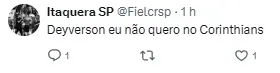 Deyverson também foi assunto, já que o jogador foi ligado ao Corinthians nos últimos dias. António é muito amigo do atacante e gostaria de tê-lo na equipe, mas esse pedido não deve ser atendido pela diretoria. A torcida se manifestou sobre o assunto nas redes sociais (confira abaixo).