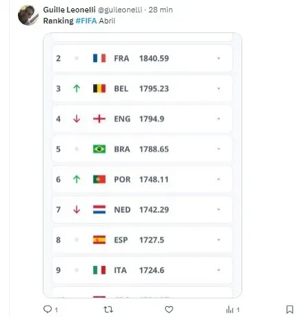 As mudanças mais significativas no top 10 ocorreram na terceira e sexta colocações. A Inglaterra, anteriormente na terceira posição, foi ultrapassada pela Bélgica, que agora ocupa esse posto. Enquanto isso, na sexta colocação, houve uma alteração com Portugal assumindo o lugar anteriormente ocupado pela Holanda.