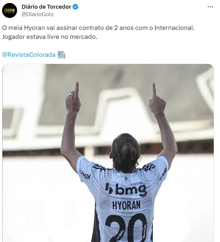 O Inter segue de olho no mercado e também está fechando a contratação do meia Hyoran, de 30 anos de idade, que defendeu as cores do Atlético-MG na última temporada.