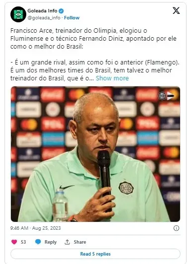Além disso, Arce teceu elogios a Fernando Diniz, que tem sido fundamental para a ascensão do Fluminense. Ele enfatizou a abordagem tática e estratégica do treinador brasileiro, destacando sua capacidade de desenvolver um estilo de jogo atraente e eficaz.