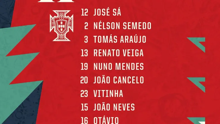 Portugal: Jorge Sá; Nelson Semedo, Tomás Araújo e Renato Veiga, João Cancelo, Otávio, João Neves, Vitinha e Nuno Mendes; João Félix e Rafael Leão.