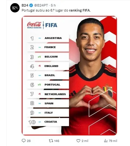 As mudanças mais significativas no top 10 ocorreram na terceira e sexta colocações. A Inglaterra, anteriormente na terceira posição, foi ultrapassada pela Bélgica, que agora ocupa esse posto. Enquanto isso, na sexta colocação, houve uma alteração com Portugal assumindo o lugar anteriormente ocupado pela Holanda.