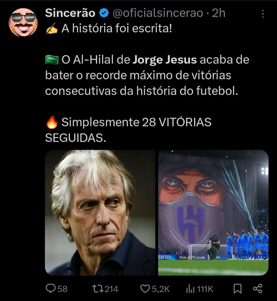É a primeira vez que um time de futebol consegue 28 vitórias consecutivas na história da modalidade. O Al-Hilal vai entrar para o livro dos recordes com o feito apesar de estar sem o principal craque da equipe: Neymar.
