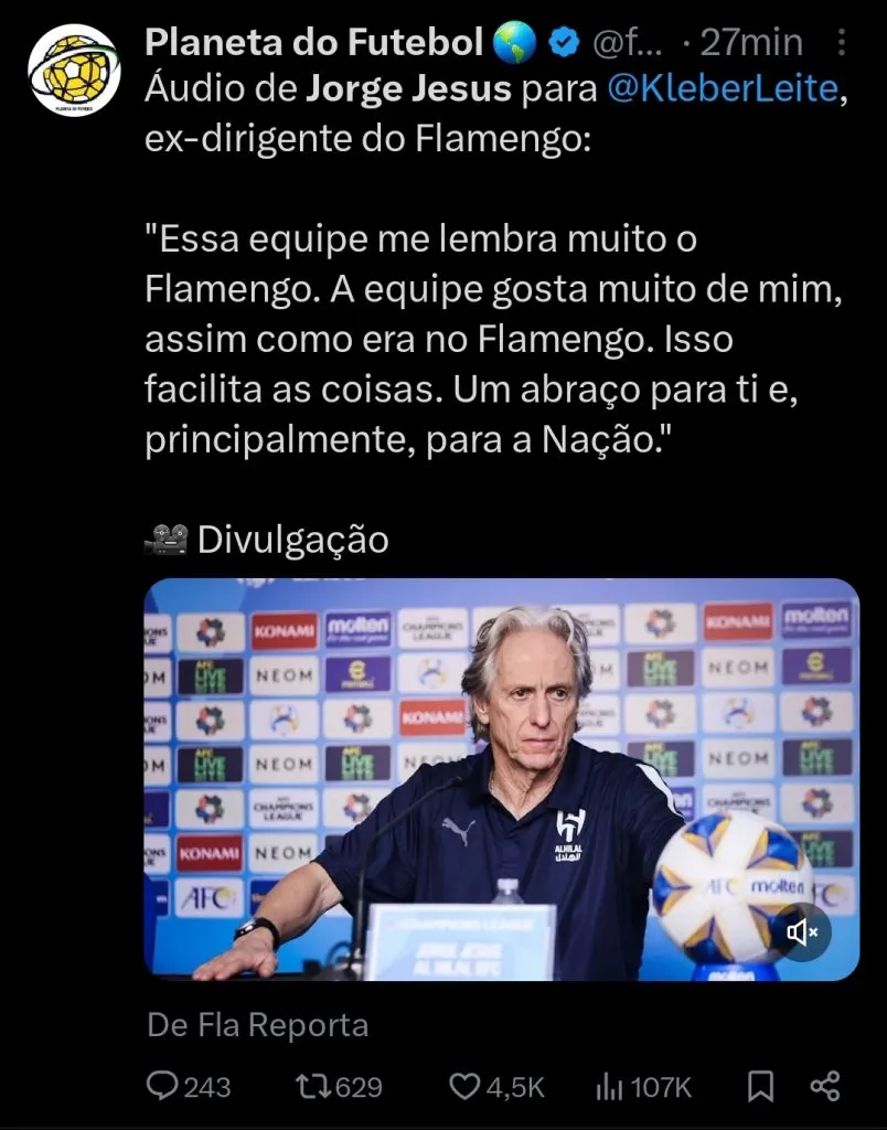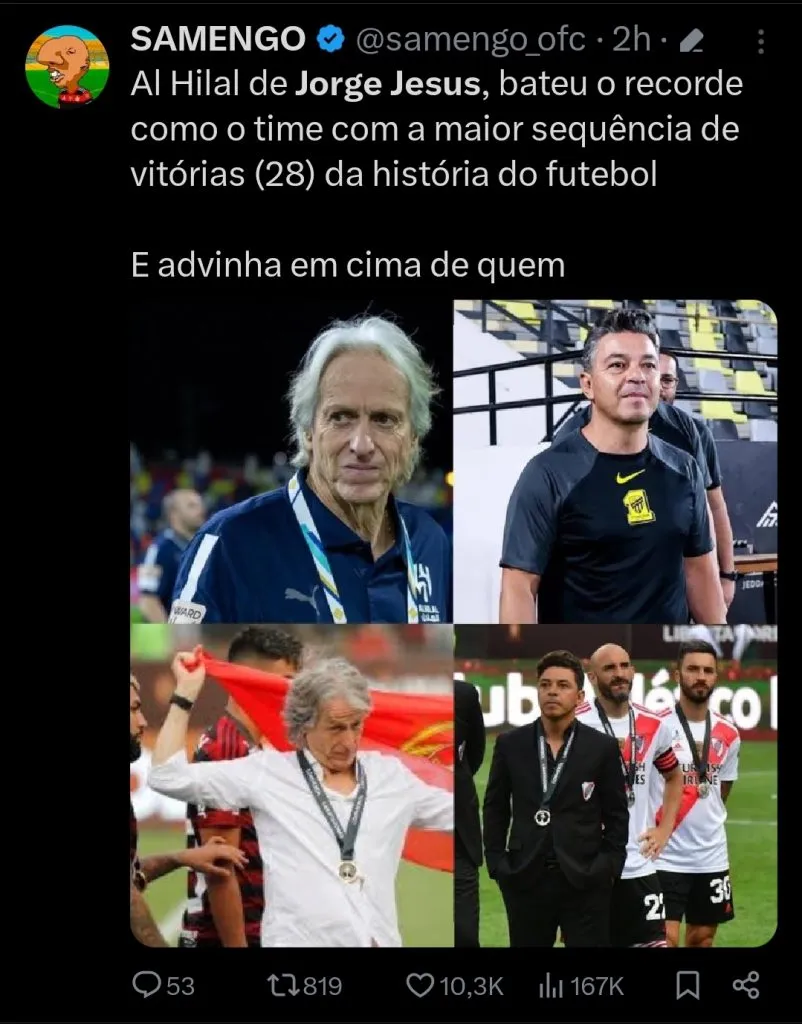 Nesta terça-feira (12), o técnico Marcelo Gallardo ganhou mais um motivo para chorar quando Jorge Jesus tiver do outro lado. O Al-Ittihad perdeu para o Al-Hilal pelo placar de 2 a 0 na Liga dos Campeões Asiática.