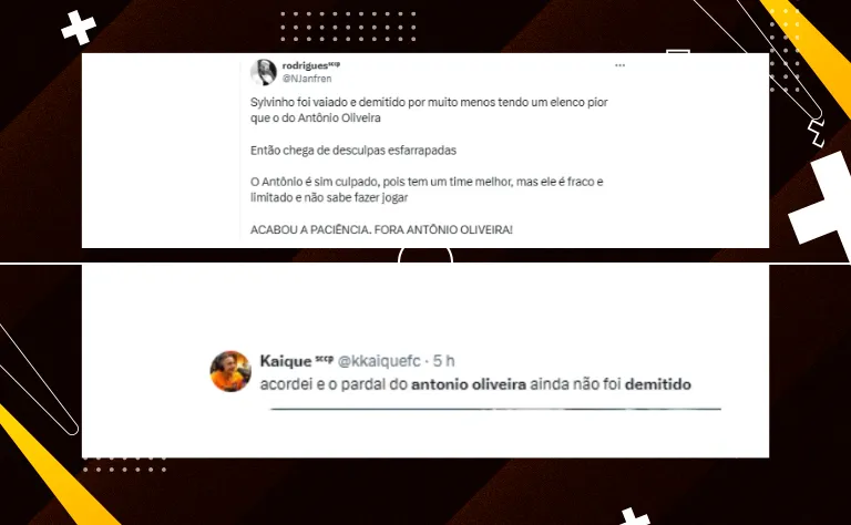 Por outro lado, uma derrota para o rival seria o fim da linha do trabalho de António Oliveira no Corinthians. Não é de agora que o treinador vem vivendo um momento de pressão.
