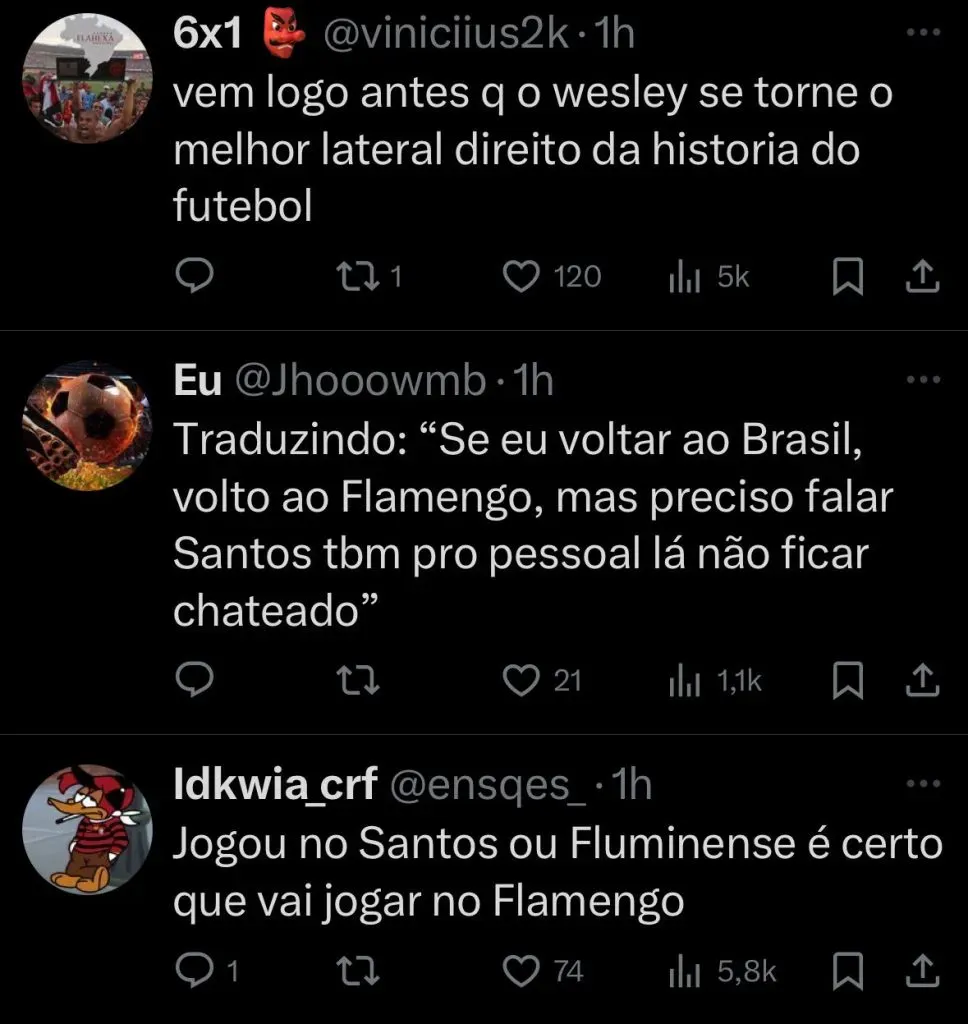 O jogador afirmou com tranquilidade “Se eu voltar ao Brasil, tenho duas prioridades: Santos e Flamengo.” destacando suas vontades na hora de retornar ao país.