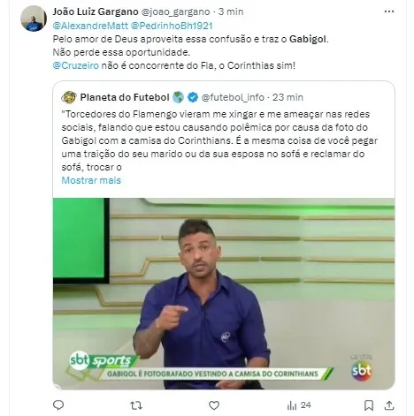 “Procurei um dirigente do Corinthians para falar sobre a foto de Gabigol. A pessoa não quis se pronunciar sobre o registro do atacante do Flamengo, mas brincou: ‘Se for verdade mesmo, até que a camisa (do Corinthians) caiu bem nele’”, disse Venê.