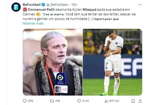 Petit também criticou as recentes homenagens feitas pelo PSG a Mbappé em sua despedida iminente. Para ele, essas homenagens são exageradas e não refletem a realidade do comportamento do jogador.