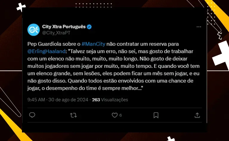 “Estou feliz com o elenco. Não esperava a saída do Julián (Álvarez). Havia conversas há bastante tempo, então poderia acontecer, mas no fim você sempre pensa “talvez ele vá ficar”. Mas não aconteceu. Claro que se tivéssemos muitas saídas seria um problema, mas Oscar Bobb, James McAtee, Gündogan, Bernardo (Silva), muitos jogadores podem jogar naquela posição. Muitos tipos diferentes de jogadores, até Erling (Haaland), claro”, falou.