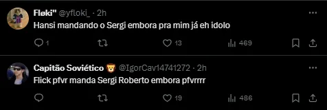 Sob protestos da torcida catalã, Sergi Roberto é um dos possíveis nomes a deixar o clube, conforme informação de Fabrizio Romano. O atleta participou de 24 jogos na última temporada, com três gols e três assistências.