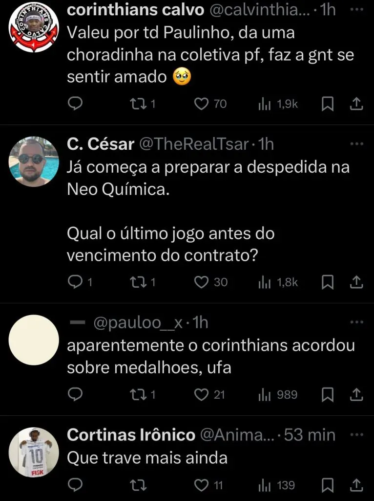 Paulinho deseja continuar no Corinthians até o final da temporada de 2025, o que implicaria em uma renovação por um ano e meio. No entanto, a diretoria do clube está inclinada a oferecer uma extensão de apenas seis meses, a informação é do Luis Fabiani da rádio Itatiaia.
