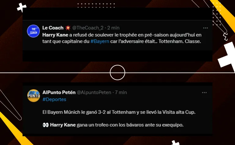 Kane e o zagueiro Eric Dier, também ex-Tottenham, foram homenageados pelo clube inglês antes do amistoso. O centroavante foi muito bem recebido pelos ex-companheiros. O camisa nove mostrou respeito ao antigo clube e, mesmo terminando a partida como capitão, quem levantou a taça foi o goleiro Manuel Neuer.