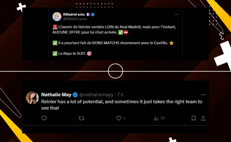 Sabendo que sua situação nos blancos é complicada, Reinier já definiu o perfil de equipe em que quer atuar. O jogador deseja se transferir para um time de primeira divisão, seja na Espanha ou em outro país. O Rayo Vallecano estaria interessado.