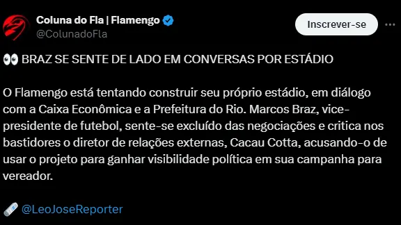 O vice-presidente do Mengão, Marcos Braz, está se sentindo escanteado nas reuniões pela compra do terreno na região portuário do Rio. O dirigente vem de uma polêmica no início da semana, que está em investigação.