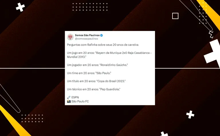 Convidado do programa “Resenha”, da ESPN, Rafinha participou de um quadro nos bastidores da emissora. Na categoria ‘melhor técnico com quem já trabalhou’, o lateral do São Paulo foi assertivo: Pep Guardiola.