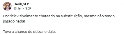 Endrick sai chateado ao ser substituído | Foto: Reprodução/Premiere