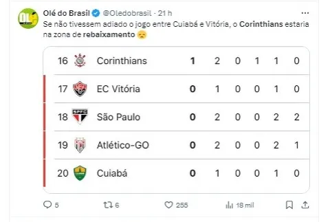 “Hoje o Corinthians está na luta para não cair, faltando ainda 36 rodadas. Quando você empata a primeira e perde a segunda, já está brigando contra o rebaixamento. Nos últimos 18 jogos, o Corinthians perdeu apenas duas partidas, mas não venceu nenhum adversário da Série A e tem marcado poucos gols. O Cássio acabou sendo responsável pelos dois gols sofridos. O Yuri Alberto teve a chance e não aproveitou”, comentou o apresentador.