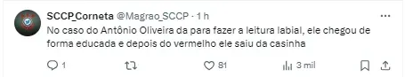 Além do presidente do Timão, o diretor de futebol do clube, Rubens Gomes, o Rubão, também estava presente nas reclamações e disse a seguinte frase: “Você é horroroso”.
