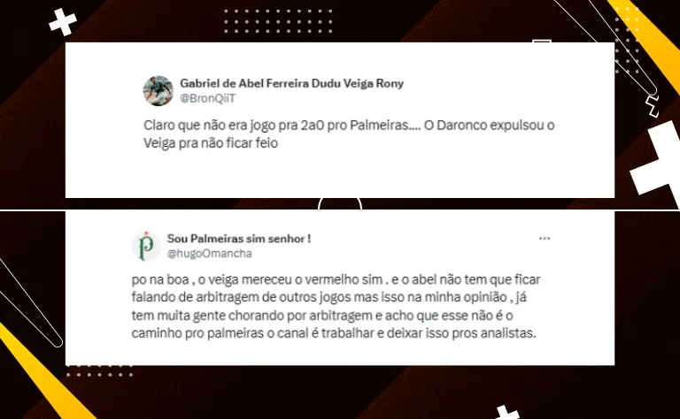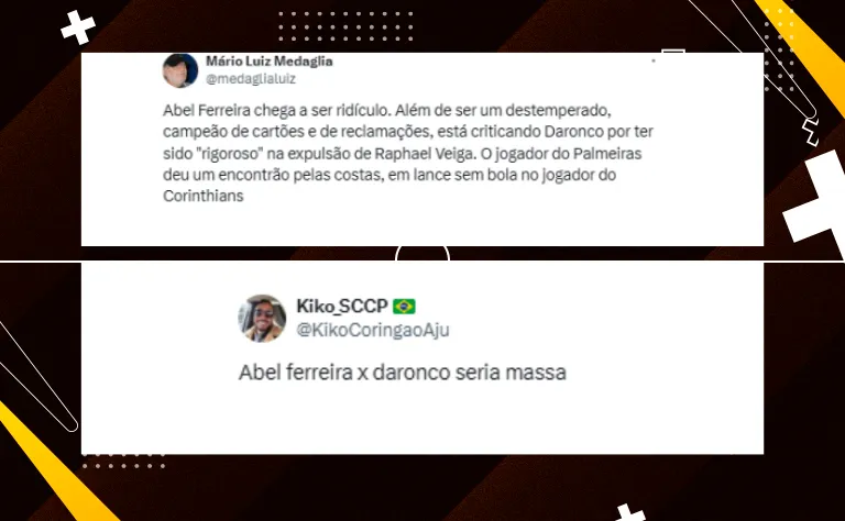Abel Ferreira reclamou o rigor de Daronco, isso porque ele expulsou Raphael Veiga no 2º tempo por agressão em Rodrigo Garro. Ele deu um tranco no corintiano durante um empurra-empurra perto da linha de fundo. O lance também envolveu Estêvão.