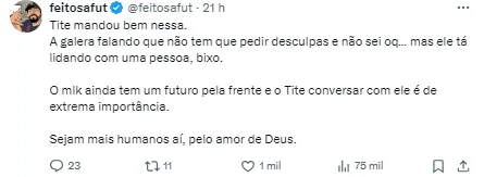 Tite chegou a conversar com o jogador à beira do campo, mas fez questão de abraçá-lo e elogiá-lo, segundo a matéria do GE. O treinador chegou a pedir desculpas ao jovem.