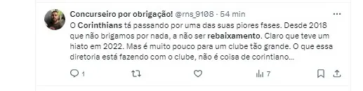 “Estive no jogo Corinthians x Botafogo e foi preocupante… a situação do Corinthians é delicada. Se não houver a contratação de quatro ou cinco reforços, o clube pode começar a fazer as contas para escapar do rebaixamento mais cedo do que o esperado. Em setembro, podemos ver o Corinthians lutando para evitar a queda. É uma situação feia!”, expressou Benjamin Back durante o programa Papo Reto.