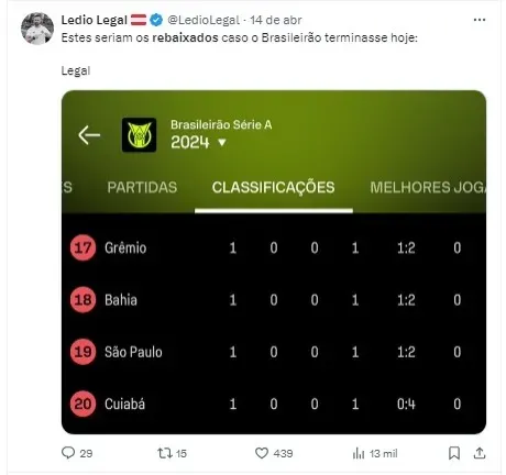O comentarista destacou que, atualmente, Vitória, Corinthians, Atlético-GO e Cuiabá ocupam as posições na zona de rebaixamento, com o Vitória e o Cuiabá tendo um jogo a menos.