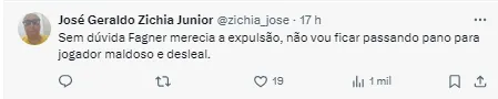 “Quase todo mês tem programa discutindo a maldade do Fagner, a entrada dura, desleal. Aí pensa que os árbitros estão ouvindo, que ele está complicado, que no próximo jogo, na primeira entrada, mas não. É impressionante. O Battaglia não era para ser expulso e foi por uma faltinha, e o Fagner, que fez uma faltona, não foi expulso. É um absurdo. Não consigo entender. É o jogador 007, tem licença para bater. E não acontece nada!”, explicou Rodrigo.
