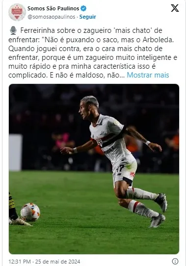 Durante a conversa, Ferreira destacou o zagueiro equatoriano Arboleda, seu colega de equipe no São Paulo, como o jogador mais desafiador que enfrentou em solo brasileiro.