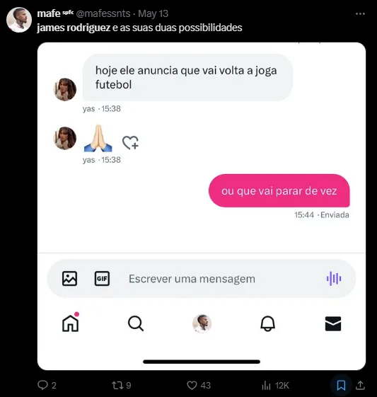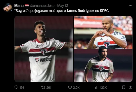 “É um jogador com contrato no São Paulo, e está cada vez mais claro que ele não está nos planos do técnico. Agora vai ter a Copa América, ele vai ser convocado, e a janela vai determinar o futuro do James. Não temos nenhuma proposta. A partida (para outro clube) tem que ser boa para o atleta e principalmente pra a instituição”, contou Casares à ESPN.
