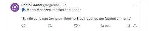 Durante uma entrevista à Rádio Grenal, na manhã dessa quinta-feira (23), Mano Menezes compartilhou suas percepções sobre o atual cenário do futebol brasileiro.