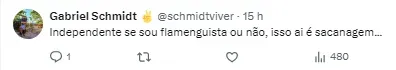 Por outro lado, caso o Palmeiras identifique o torcedor, não será punido. Em entrevista após a partida, o treinador do Flamengo desabafou pedindo mais respeito: “As ofensas são do jogo, mas cusparada é muito feio, cara. Eu ter que limpar minha cabeça e minha roupa é feio”, disse.