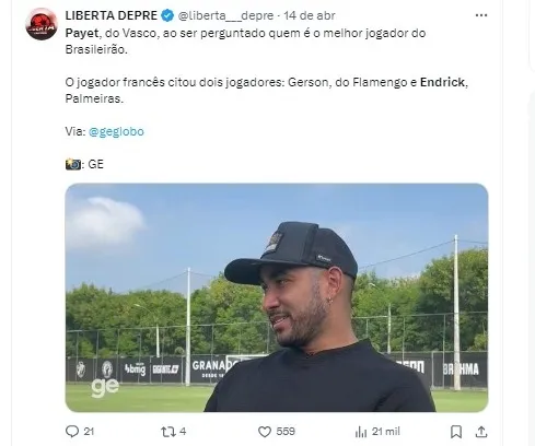Em uma entrevista ao “ge“, Payet foi questionado sobre quem, na sua opinião, é o melhor jogador em atividade no futebol brasileiro, e ele prontamente apontou Endrick, do Palmeiras, e Gerson, do Flamengo.