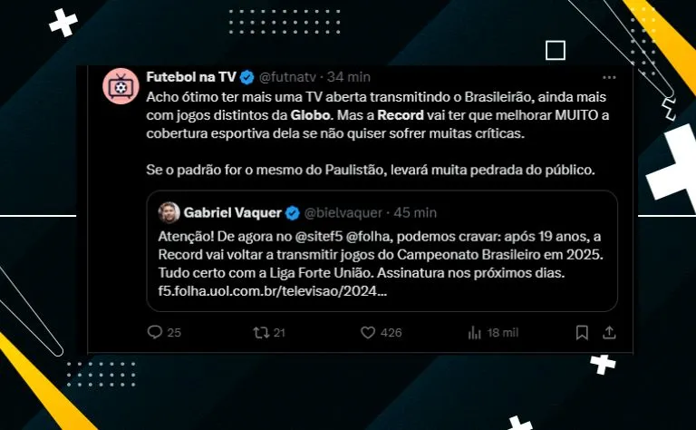 A Record volta a transmitir o Campeonato Brasileiro após 19 anos. O jornalista Gabriel Vaquer acaba de trazer a informação no F5, da UOL Esporte, e detalha o tempo do acordo.