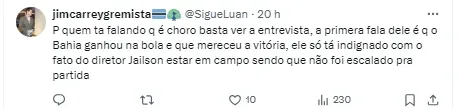 O técnico da equipe gaúcha acusou uma interferência na arbitragem. Segundo ele, o ex-árbitro Jilson Macedo Freitas, presidente da comissão de arbitragem da Federação Baiana, indicou a expulsão do atacante Diego Costa ao quarto árbitro.
