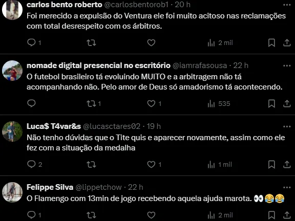 Em uma das reclamações feitas à arbitragem, Jair acabou sendo expulso e o próprio treinador do Fla, Tite, defendeu o colega de profissão com a atitude do juiz.