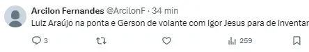 A torcida se manifestou nas redes sociais com uma certa preocupação. Muitos até concordaram, mas outros pediam Luiz Araújo e Gabi como titulares, por exemplo, e que o treinador já estaria inventando na escalação. Veja abaixo a manifestação da torcida (SIC).