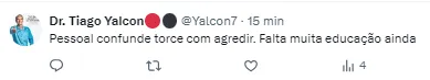 “Elas são de algumas pessoas que talvez não tenham a condição de saber que tem um monte de criançada que dá para educar. As ofensas são do jogo, mas cusparada é muito feio, cara. Eu ter que limpar minha cabeça e minha roupa é feio”, disse.