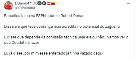 “Estamos trabalhando o Robert. É um jogador jovem, que tem muita qualidade e a gente tem certeza que ele vai nos ajudar. Conversamos com ele, tentando entender o que foi o erro. Tudo que a gente falar vai ser internamente“, começou.