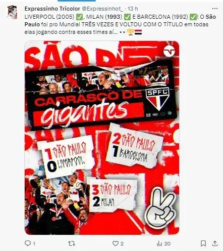 “O São Paulo sempre teve essa cara de Mundial. Na minha opinião, 92 e 93 é o único time que, se jogasse uma Champions, ganhava. Pode pegar toda a história do Mundial, qualquer time brasileiro, nenhum ganharia uma Champions League. O São Paulo, não. O São Paulo deitava nos caras”, completou Cicinho.