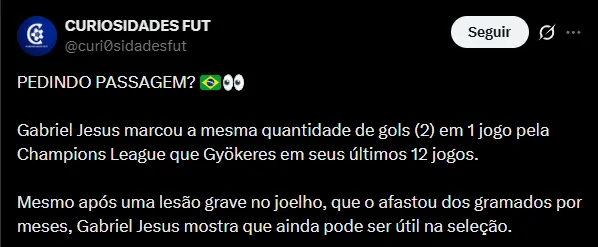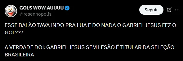Nas redes sociais, os torcedores se mostraram bastante animados com a atuação de Gabriel Jesus. Eles pedem seu retorno a Seleção Brasileira e acreditam que ele seria uma ótima opção para compor o setor.