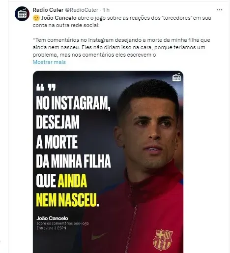 “Tem comentários no Instagram que desejam a morte da minha filha ainda não nascida. Não falam isso na minha cara, tenho certeza, porque vamos ter problemas, mas nos comentários falam o que quiserem”, desabafou João Cancelo em entrevista à ESPN.