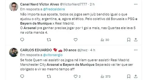 O primeiro jogo entre Bayern e Arsenal está marcado para o dia 9 de abril, no Emirates Stadium, enquanto a partida de volta será disputada no dia 17 do mesmo mês, na Allianz Arena. Quem avançar enfrentará o vencedor do duelo entre Real Madrid e Manchester City nas semifinais.