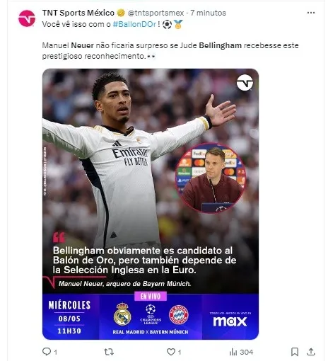 Em uma entrevista coletiva prévia ao duelo, o capitão e goleiro alemão, Manuel Neuer, não poupou elogios a Bellingham, destacando sua trajetória desde os tempos na Bundesliga e apontando-o como um forte candidato ao prêmio de melhor jogador do mundo nesta temporada.