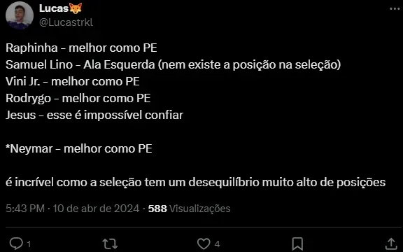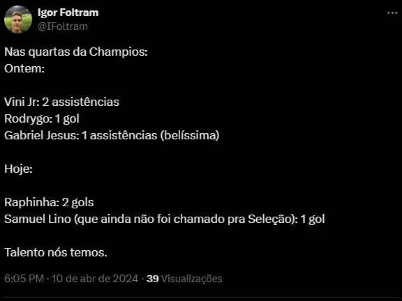 O lateral-esquerdo vem sendo muito elogiado pela atuação de hoje e só mostra cada vez mais que deve ser testado com a Amarelinha, tendo condição de brigar com Wendell e Ayrton Lucas – últimos convocados.