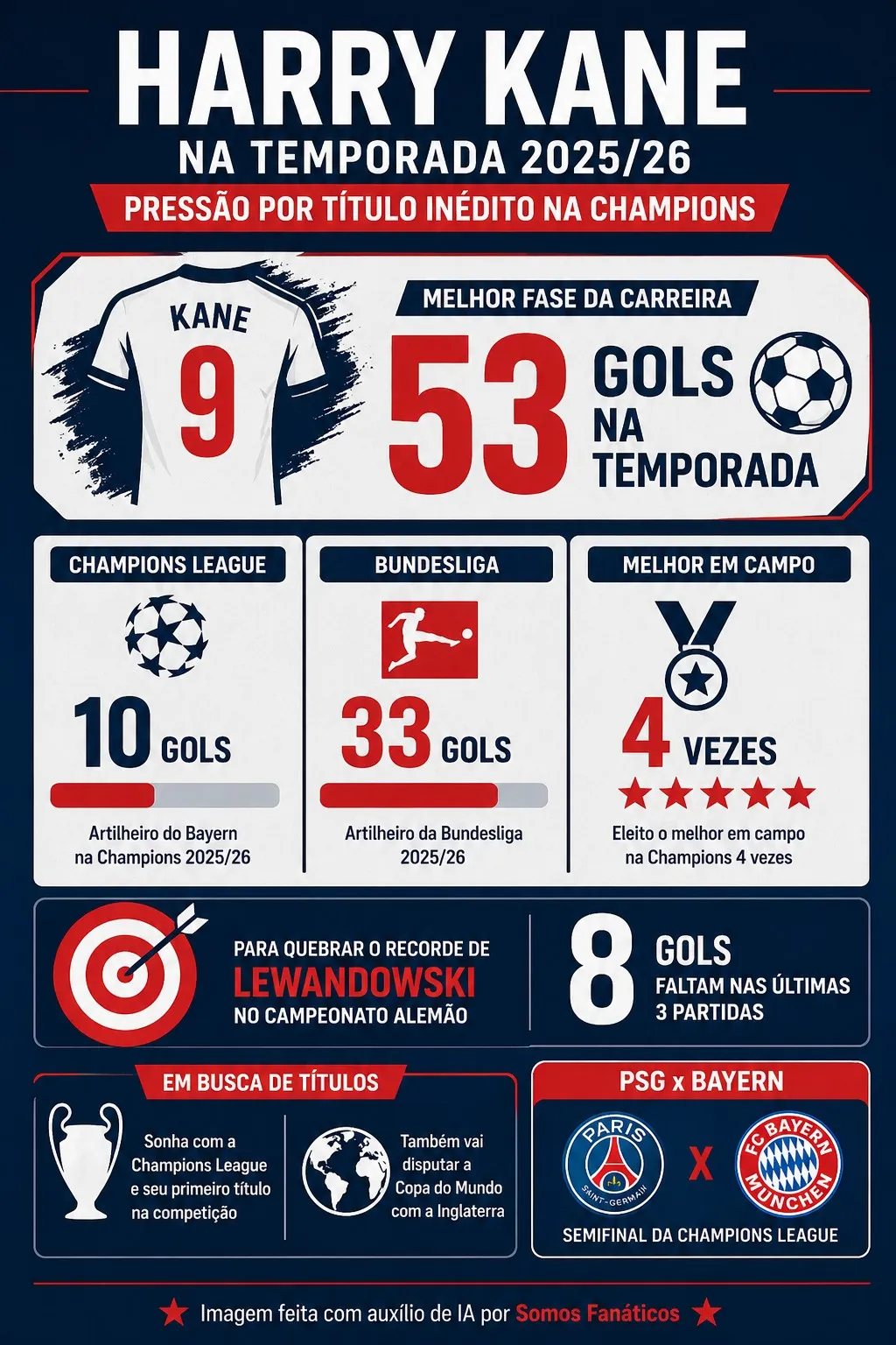 Na Liga dos Campeões 2025/26, Kane já balançou as redes 10 vezes, além de ter sido eleito quatro vezes o melhor em campo. Na Bundesliga, o centroavante é o artilheiro da competição com 33 gols.