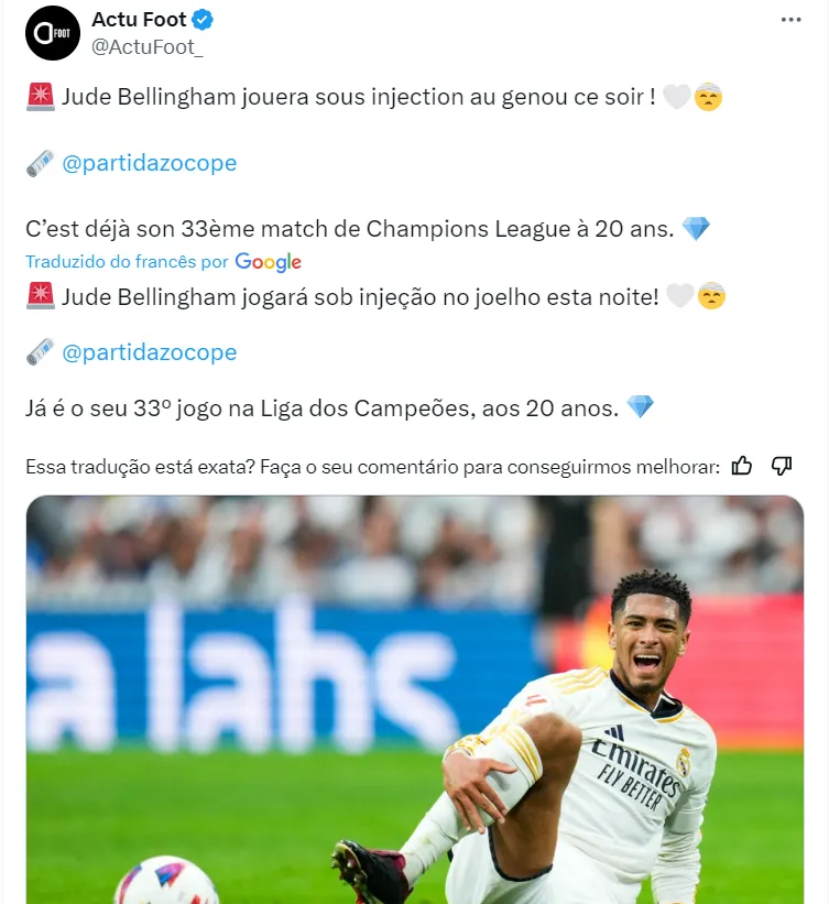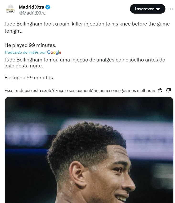 Bellingham jogou com o joelho sob injeção de analgésico para aguentar a intensidade de uma partida de alto nível de Champions League. No final das contas, o jogador atuou por mais de 90 minutos.