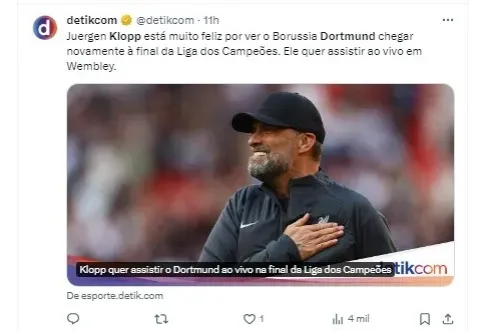 Em uma entrevista recente, Klopp deixou claro que não estará na posição de comentarista, mas sim na de torcedor. “Serei um torcedor do Dortmund no dia 1º de junho. Comentarista? Está louco?”, brincou o alemão.