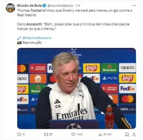 Em resposta às declarações confiantes de Tuchel, o treinador do Real Madrid, Carlo Ancelotti, respondeu com humor, brincando sobre as chances de seus próprios jogadores marcarem.